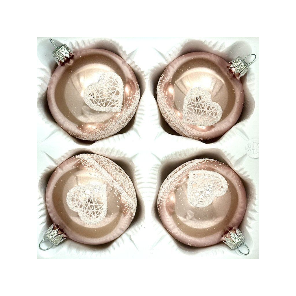 Romantické ružové vianočné gule so srdiečkami – sada 4 ks (7 cm)