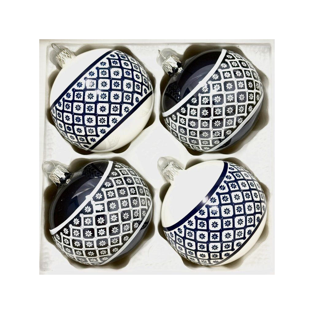 Elegantná sada 4 ks českých sklenených vianočných ozdôb s priemerom 8 cm s ručne maľovaným modrobielym dekorom inšpirovaným tradičnou keramikou.