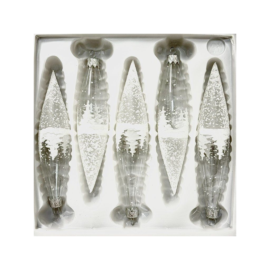 Elegantná sada 5 sklenených vianočných cencúľov o veľkosti 14 cm s jemným dekorom zimnej krajiny a trblietavými vločkami prinesie na váš stromček kúzlo zimnej rozprávky.