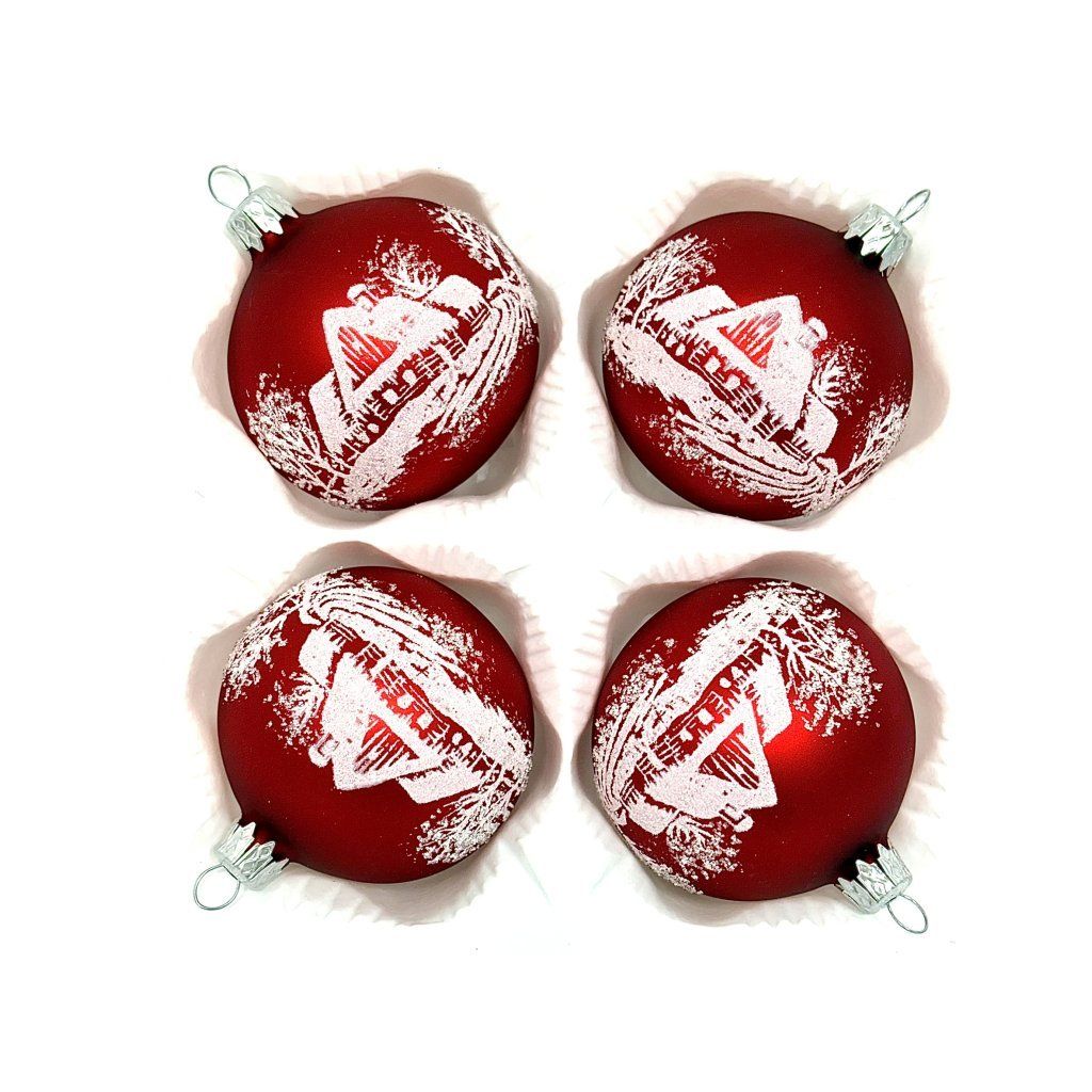 Sklenené vianočné gule 7 cm „Vianoce na chalupe“ – Červená s bielym zimným motívom ( sada 4 ks )