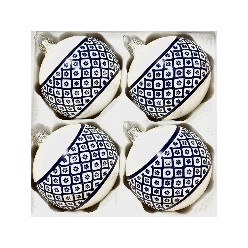 Tradičné české sklenené vianočné ozdoby 8 cm – modrobiely folklórny vzor, súprava 4 ks