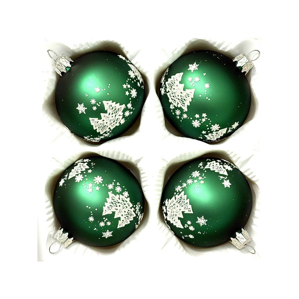Tradičné zelené vianočné gule zo skla s bielym stromčekom a vločkami. Ručne vyrábaná súprava 4 ks pre elegantnú výzdobu stromčeka.