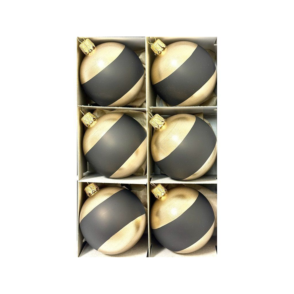 Elegantná sada 6 ks sklenených gulí 6 cm v čierno-zlatom prevedení. Ručne fúkané ozdoby pre moderný vianočný stromček.