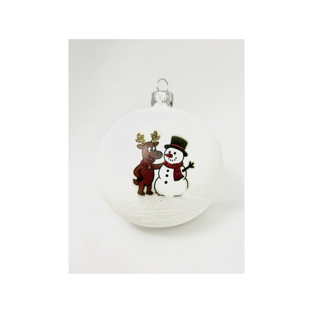 Ručne vyrábaná vianočná guľa s priemerom 8 cm s hravým motívom soba a snehuliaka. Dodávaná v luxusnej darčekovej krabičke, možnosť personalizácie vlastným textom.