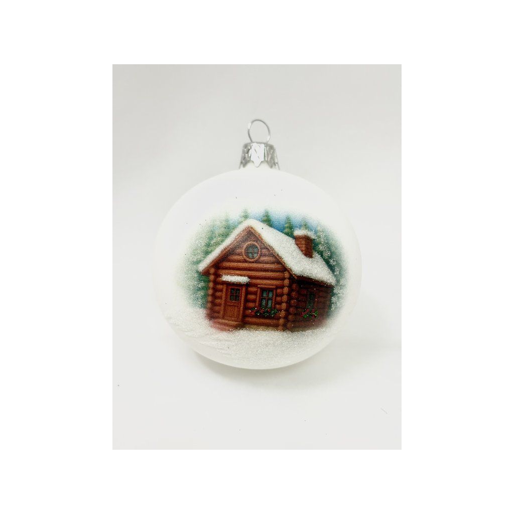 Sklenená guľa s priemerom 8 cm s motívom zasneženej chalúpky. Ručná výroba, luxusné balenie a možnosť doplniť ozdobu vlastným textom.