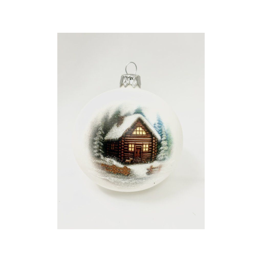 Ručne fúkaná vianočná guľa s priemerom 8 cm s motívom zasneženej chalúpky, ktorej okná žiaria teplým svetlom. Dodáva sa v darčekovom balení s možnosťou personalizácie textom.