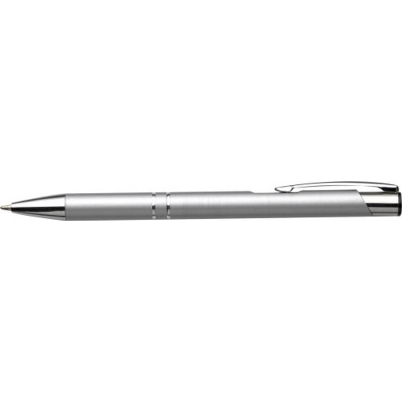 Guľôčkové pero so striebornými doplnkami, modrá náplň, hliník. Odporúčaná technológia potlače: gravír. Maximálna veľkosť potlače: 40 x 5 mm. Rozmery: ø 1 x 13,5 cm.