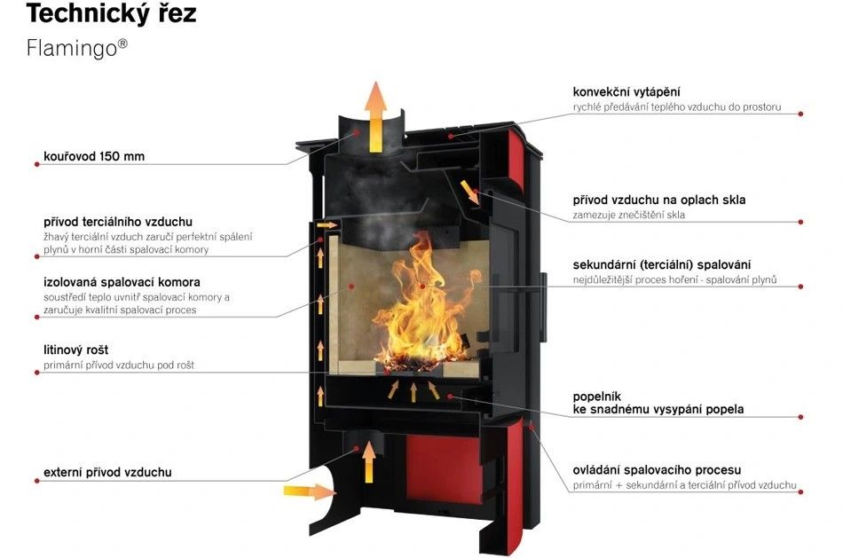 Krbové kachle Flamingo ponúkajú štandardnú možnosť napojenia externého prívodu vzduchu. Pre čo najefektívnejšie spaľovanie je privedený vzduch ďalej rozdelený na primárne (pod rošt), sekundárne na oplach skla a terciárne na podporu spaľovania plynných častíc.