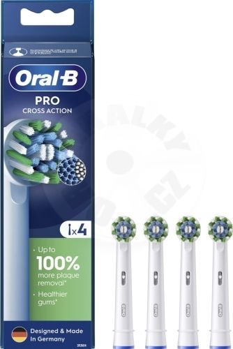 Oral-B náhradné hlavice Pro Cross Action sú z prémiových kefkových hláv od značky Oral-B. Majú dokonale skosené vlákna pod uhlom 16 stupňov, ktoré odstraňujú až o 100% viac zubného povlaku ako bežná manuálna zubná kefka. Majú indikátor opotrebenia kefkovej hlavy kedy farba vlákien sa zmení zo zelenej na žltú a upozorňuje tak, kedy je hlavu nutné vymeniť. Unikátne vlákna prenikajú hlboko do medzizubných priestorov, kde odstraňujú zubný povlak, a celú ústnu dutinu vyčistia lepšie ako bežná manuálna zubná kefka. Kompatibilný so všetkými elektrickými kefkami od značky Oral-B – okrem modelov Pulsonic & iO.