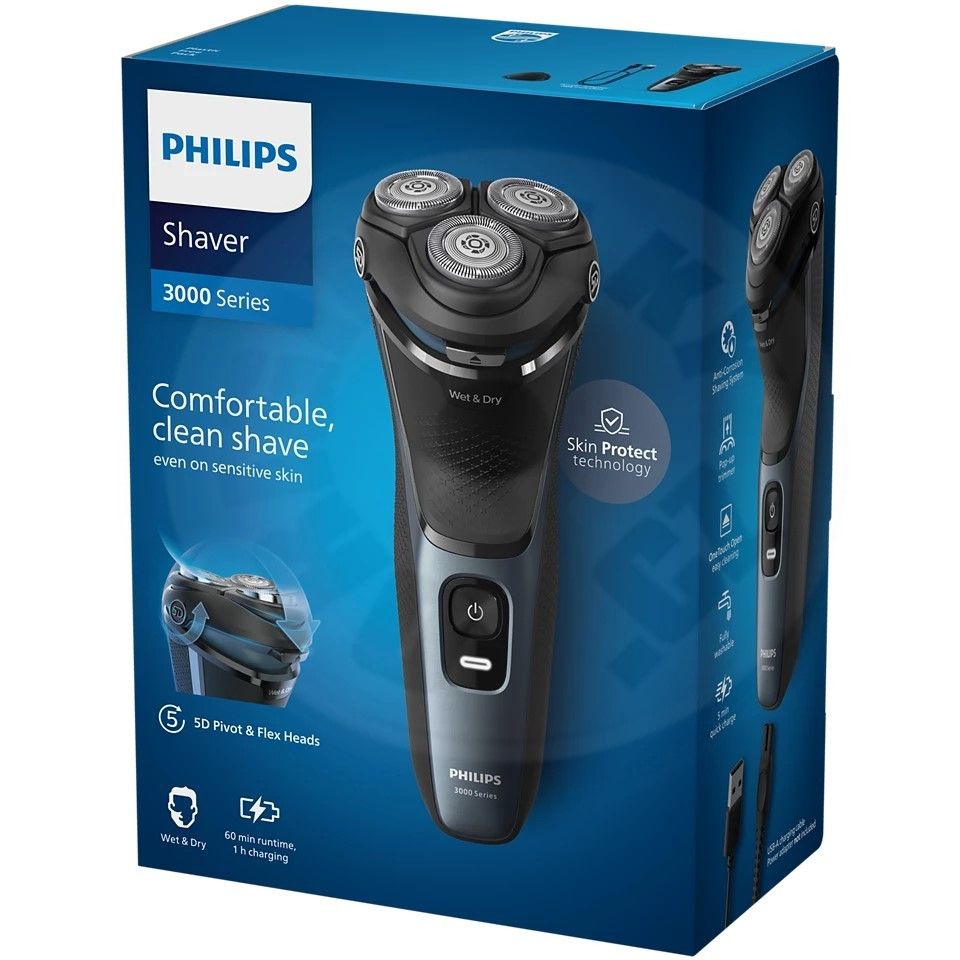 Elektrický holiaci strojček Philips Shaver radu 3000 pre mokré a suché holenie vám zaistí pohodlné a čisté oholenie, a to aj na citlivej pokožke. 5D hlavica Pivot & Flex, 27 samoostriacich čepieľok PowerCut a použitie za mokra aj za sucha zaisťujú vždy vynikajúce a spoľahlivé výsledky. Vhodné na holenie hlavy!
