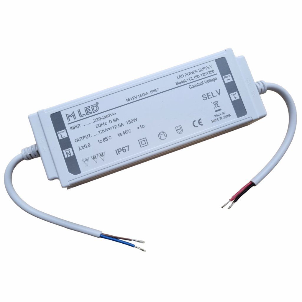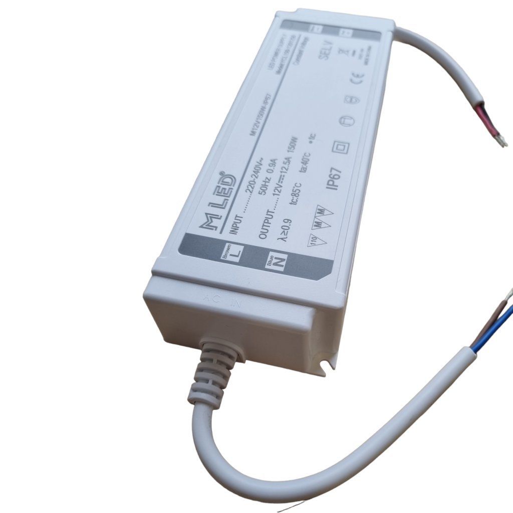 Napájací zdroj značky MLED s výkonom 150W pre LED pásy a iné LED osvetlenie s konštantným napätím 12V určený pre exteriér ako aj interiér.