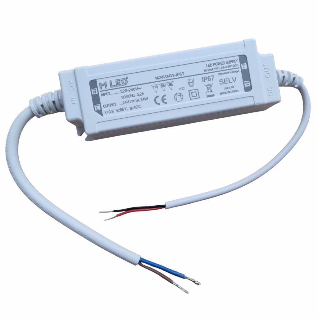 Napájací zdroj značky MLED s výkonom 24W pre LED pásy a iné LED osvetlenie s konštantným napätím 24V určený pre exteriér ako aj interiér.