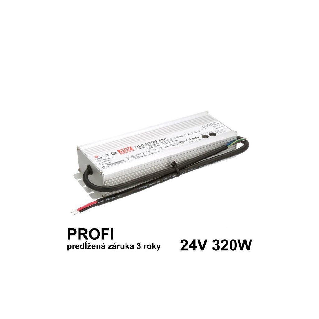 Profi napájací zdroj značky MEAN WELL s výkonom 320W, PFC a krytím IP65 vhodný pre LED pásy a iné LED osvetlenie s konštantným napätím 24V určený pre exteriér ako aj interiér.