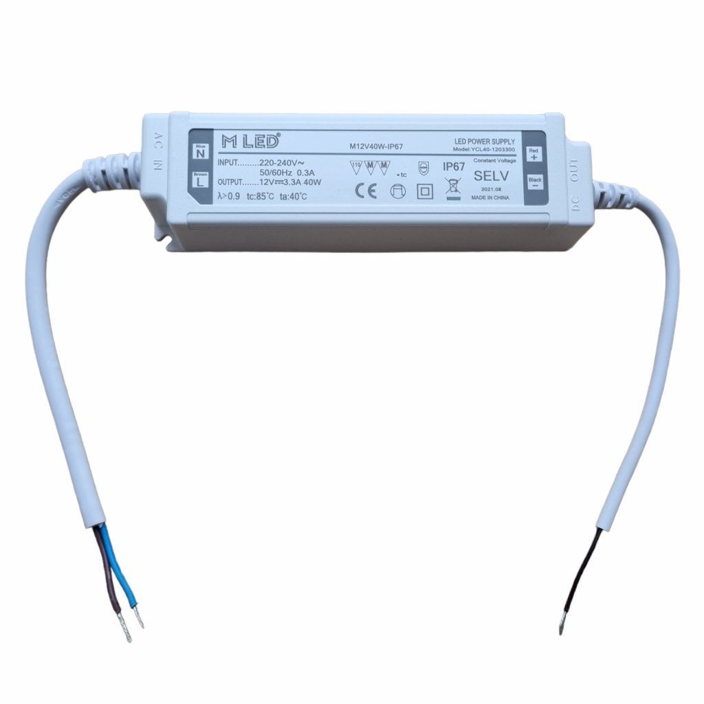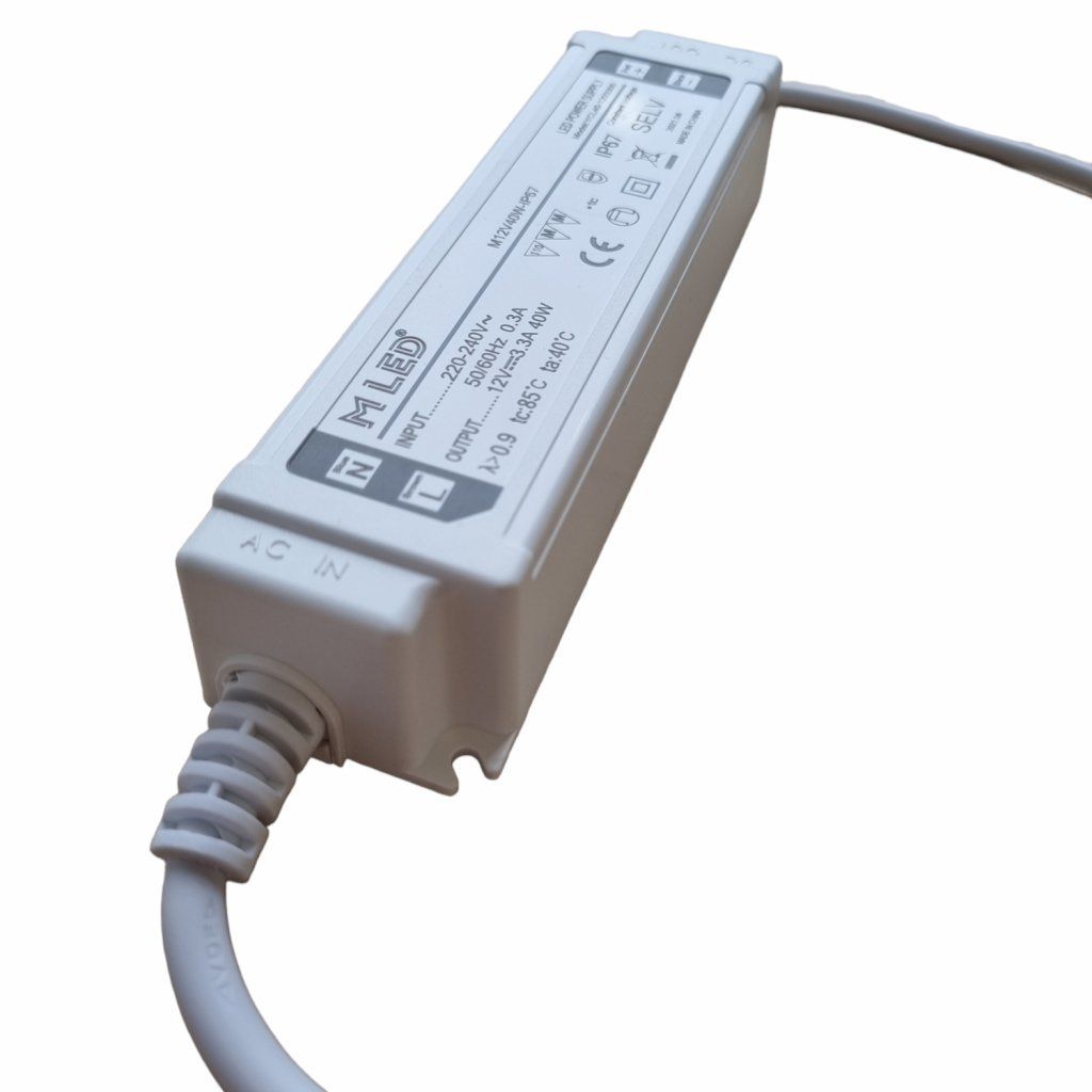 Napájací zdroj značky MLED s výkonom 40W pre LED pásy a iné LED osvetlenie s konštantným napätím 12V určený pre exteriér ako aj interiér.