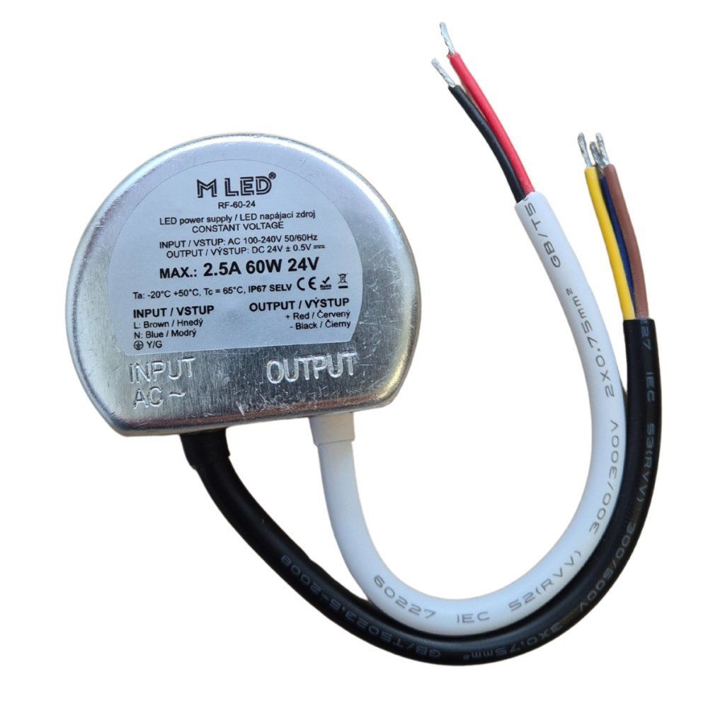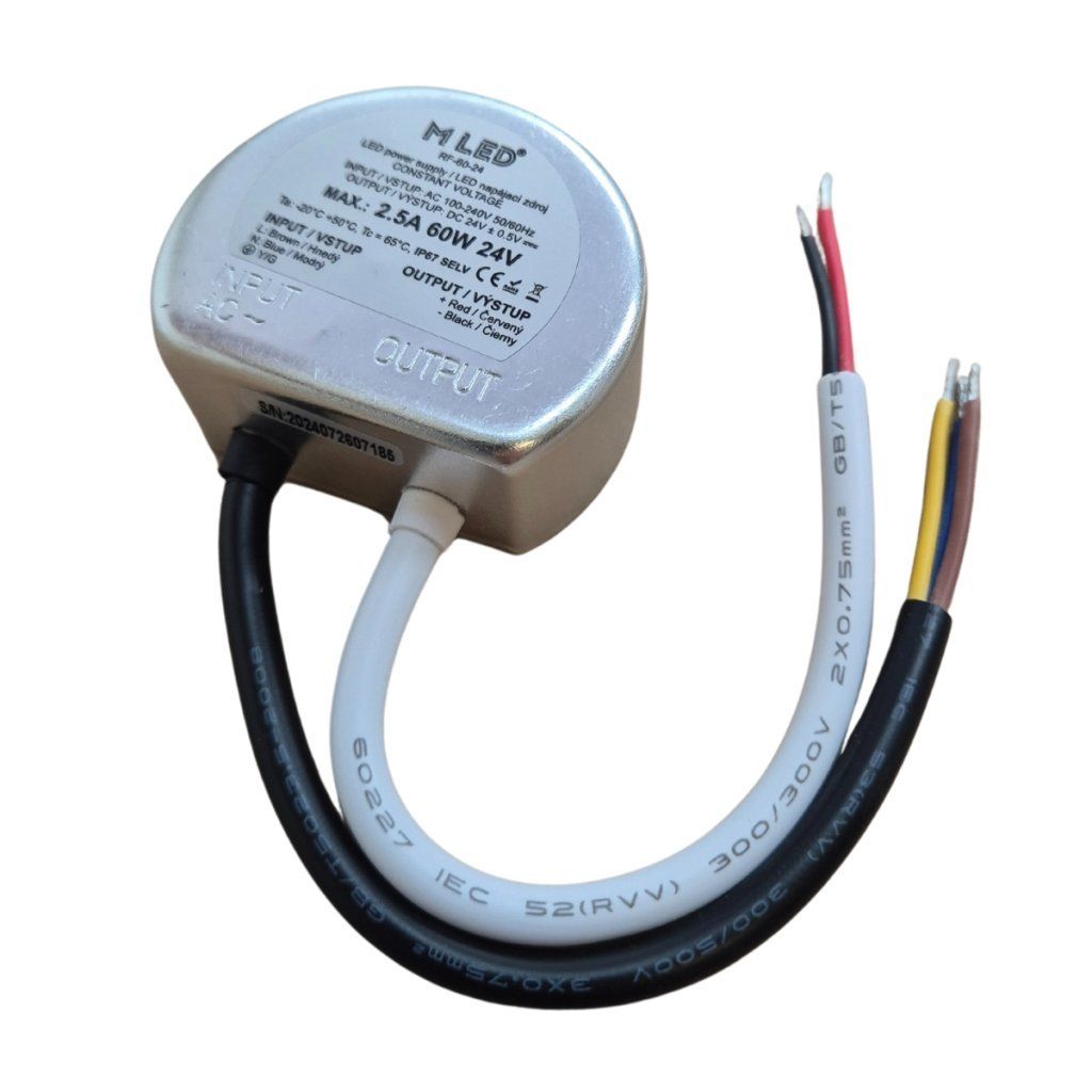 Napájací zdroj s výkonom 60W poskytuje spoľahlivé napájanie pre LED pásy a iné LED osvetlenie s konštantným napätím 24V. Vďaka krytiu IP67 je odolný voči prachu a vode, ideálny pre náročné podmienky a exteriéry. Navrhnutý na montáž do inštalačných krabíc pre jednoduchú a bezpečnú inštaláciu, zdroj zaisťuje stabilný výkon a vysokú odolnosť, vhodný pre rôzne osvetľovacie projekty vyžadujúce trvanlivosť a výkon v akýchkoľvek podmienkach.