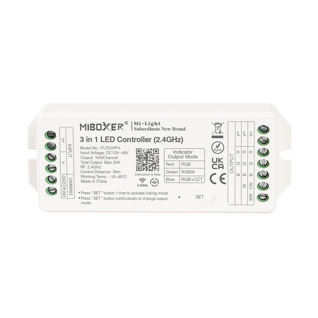 LED prijímač FUT037P+ je univerzálny prijímač navrhnutý špeciálne pre LED pásy typu RGB, RGB-W a RGB-CCT. S maximálnym zaťažením až 20A poskytuje dostatočnú kapacitu pre širokú škálu osvetľovacích aplikácií. Pri použití s 12V LED pásmi to predstavuje až 240W, zatiaľ čo pri 24V LED pásmi až 480W. To znamená, že máte flexibilitu pri výbere osvetlenia s rôznou intenzitou a spotrebou energie. Inštalácia je rýchla a jednoduchá vďaka svorkám, ktoré umožňujú bezpečné a spoľahlivé pripojenie bez potreby zložitého zapojenia. Vďaka malým rozmerom je FUT037P+ ideálny pre inštalácie v obmedzených priestoroch alebo na miestach, kde je potrebné udržať nenápadný vzhľad.