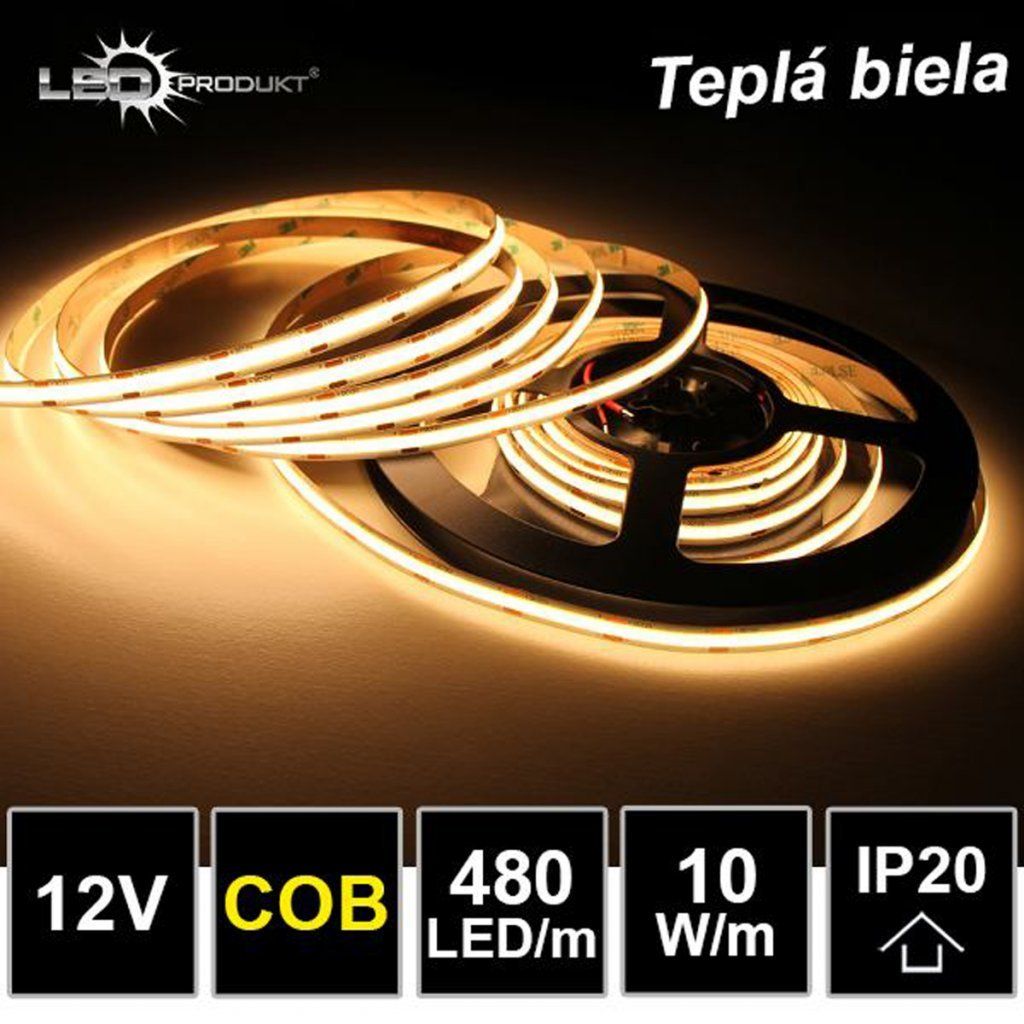 Zapáľte svetlo na najlepšiu kvalitu s naším LED pásikom 480LED/m COB 10W/m v teplej bielej farbe! Tento produkt je špičkový v oblasti LED osvetlenia, vďaka použitiu COB technológie, ktorá zaručuje čistú líniu osvetlenia bez viditeľných bodov.