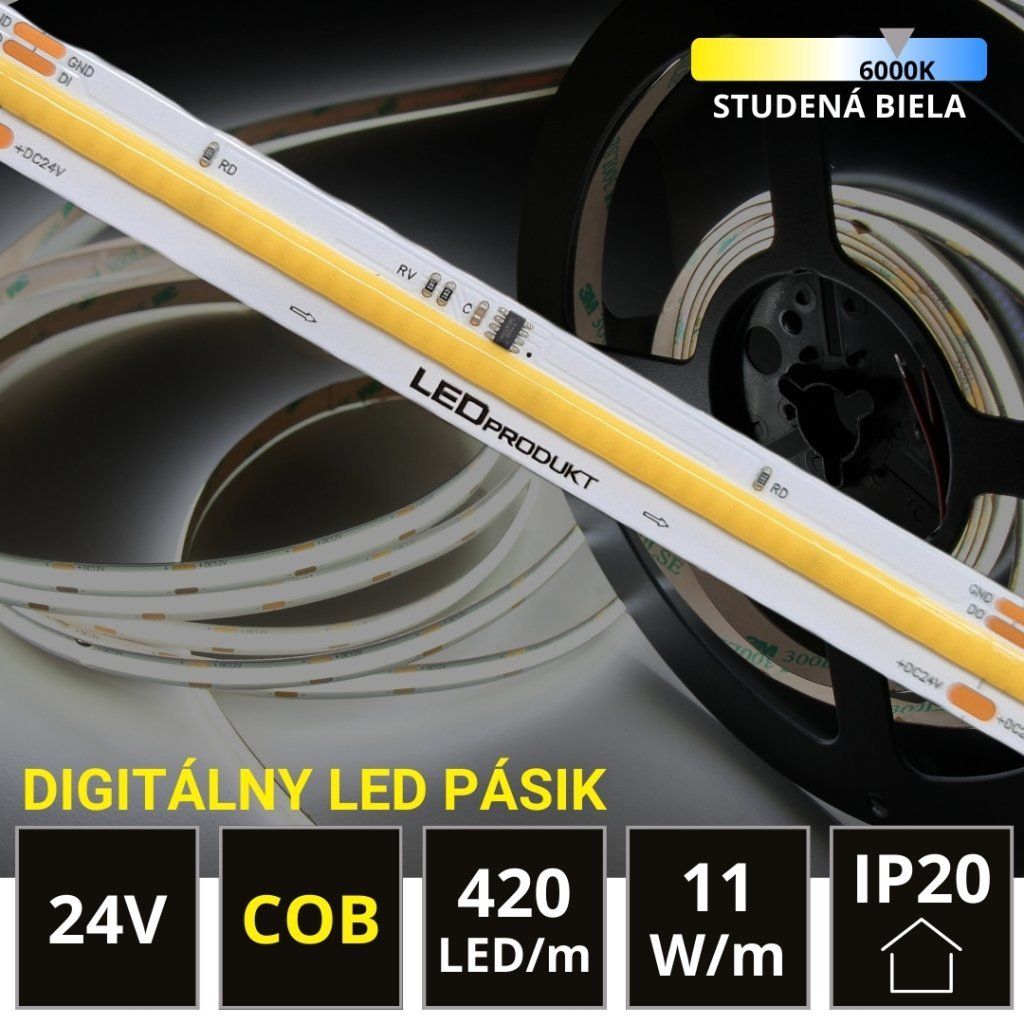 Prineste do svojho priestoru moderné osvetlenie s naším digitálnym 5m LED pásom SPI RUNNING s COB technológiou. S hustotou 420 LED/m poskytuje jasné a rovnomerné svetlo v studenej bielej farbe, ideálne pre osvetlenie interiérov. Pásik pracuje na 24V a spotrebováva len 11W/m. S krytím IP20 je vhodný na použitie v vnútorných priestoroch. Vytvorte dynamické svetelné efekty s SPI rozhraním a užívajte si štýlové osvetlenie s vysokou kvalitou.