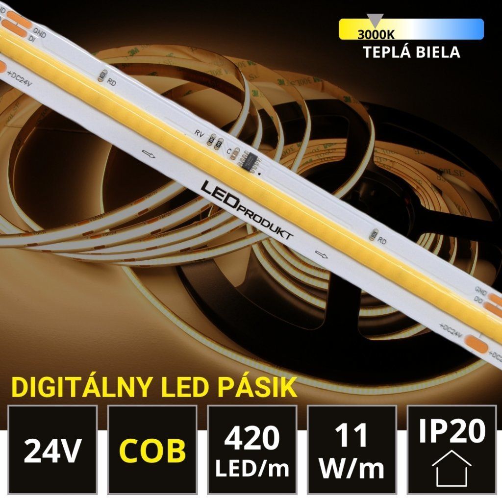 Prineste do svojho priestoru moderné osvetlenie s naším digitálnym 5m LED pásom SPI RUNNING s COB technológiou. S hustotou 420 LED/m poskytuje jasné a rovnomerné svetlo v studenej bielej farbe, ideálne pre osvetlenie interiérov. Pásik pracuje na 24V a spotrebováva len 11W/m. S krytím IP20 je vhodný na použitie v vnútorných priestoroch. Vytvorte dynamické svetelné efekty s SPI rozhraním a užívajte si štýlové osvetlenie s vysokou kvalitou.