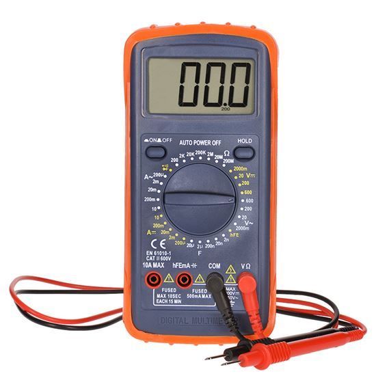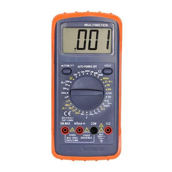 Digitálny multimeter na meranie napätia, prúdu, odporu a kapacity. Ponúka test spojitosti obvodu, test diód a meranie hFE (0-1000). Funkcia automatického vypnutia a uchovávanie poslednej hodnoty. Ochrana proti preťaženiu a indikácia slabej batérie. Napätie: DC 2000mV - 600V (±0,5%), AC 2000mV - 600V (±1%), prúd: DC 200uA - 10A (±1,8%), odpor: 200Ω - 200MΩ (±1%). kapacita: 2nF - 20uF (±4%). napájanie: 9V batérie (nie sú súčasťou balenia). rozmery: 193x90x37mm, hmotnosť: 251g.