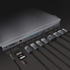 Klávesnica vďaka tomu bude pod lepším uhlom a ergonómia pri práci bude príjemnejšia. Dokovacia stanica je kompatibilná so všetkými zariadeniami vybavenými USB C portom bez ohľadu na operačný systém. Podporované operačné systémy sú MacOS, IpadOS, Windows 7/8/10, Chromebook a Android. Špičkový Type C port 3.2 Gen.2 udržuje vaše zariadenie plne nabité vďaka technológii Power Delivery 3.0, ktorá podporuje nabíjací výkon až 100 W. Tri video výstupné porty HDMI – 4K/30 Hz, DisplayPort – 4K/30 Hz a VGA – 1080P/60 Hz umožňujú rozšírenie pracovnej plochy o dva monitory naraz (VGA + HDMI alebo DisplayPort + HDMI) Príslušenstvo k notebooku ako napríklad myš a klávesnicu pripojíte k dokovacej stanici vďaka trom USB A portom. 1× USB 2.0 vhodné na zapojenie myši, pripadne klávesnice. Pre rýchlu prácu so súbormi je k dispozícii 2× USB 3.0 so skvelou prenosovou rýchlosťou dát až 5 Gps. Bezpečné a rýchle pripojenie k sieti LAN (internetu) pomocou RJ-45 Ethernet portu, s podporou rýchlostí 10/100/1000 Mbps. Dva sloty na pamäťové karty SD a Micro SD s prenosovou rýchlosťou dát až 5 Gps podporujú tiež formáty SDXC, SDHC a Micro SDHC. Drôtové slúchadlá vrátane mikrofónu je možné použiť prostredníctvom 3,5 mm jack portu. Hliníkový obal slúži ako efektívny odvod tepla vyžarovaného notebookom, tým zaručuje lepšie chladenie vášho zariadenia. Odnímateľný prepájací USB-C kábel, je možné nahradiť dlhším variantom a tým prispôsobiť dokovaciu stanicu priamo k vášmu zariadeniu.