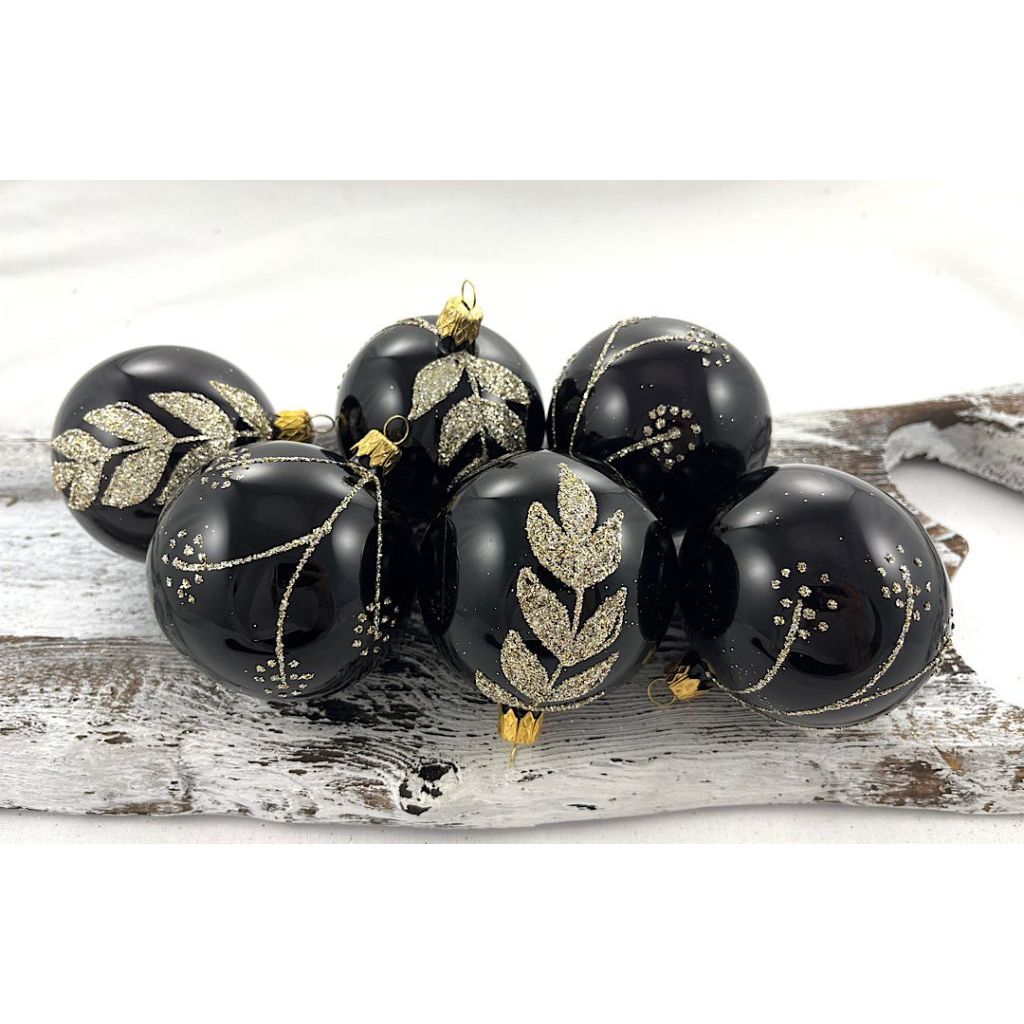 Sklenené vianočné gule , nestriebrené (pri pohľade do svetla cez ozdobu vidíte) v čiernej elegantnej farbe s dekorom tzv. platina (mix strieborného a zlatého posypu) . Z jednej strany sa nachádzajú bohaté listy a z druhej jemné vetvičky.