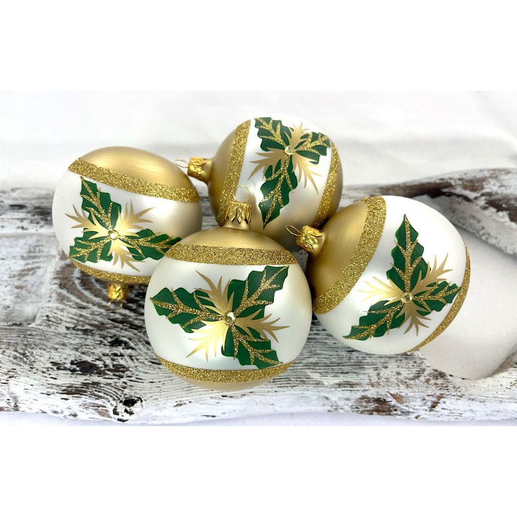 Sklenené luxusné vianočné gule maľované z oboch strán. Zelené listy sú doplnené zlatými vetvičkami. V strede kamienok.