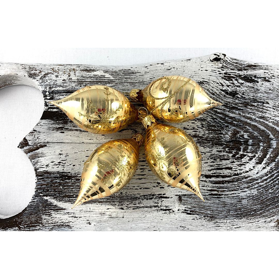 Sklenené olivky v zlatej, lesklej farbe s vločkou a špirálkami.