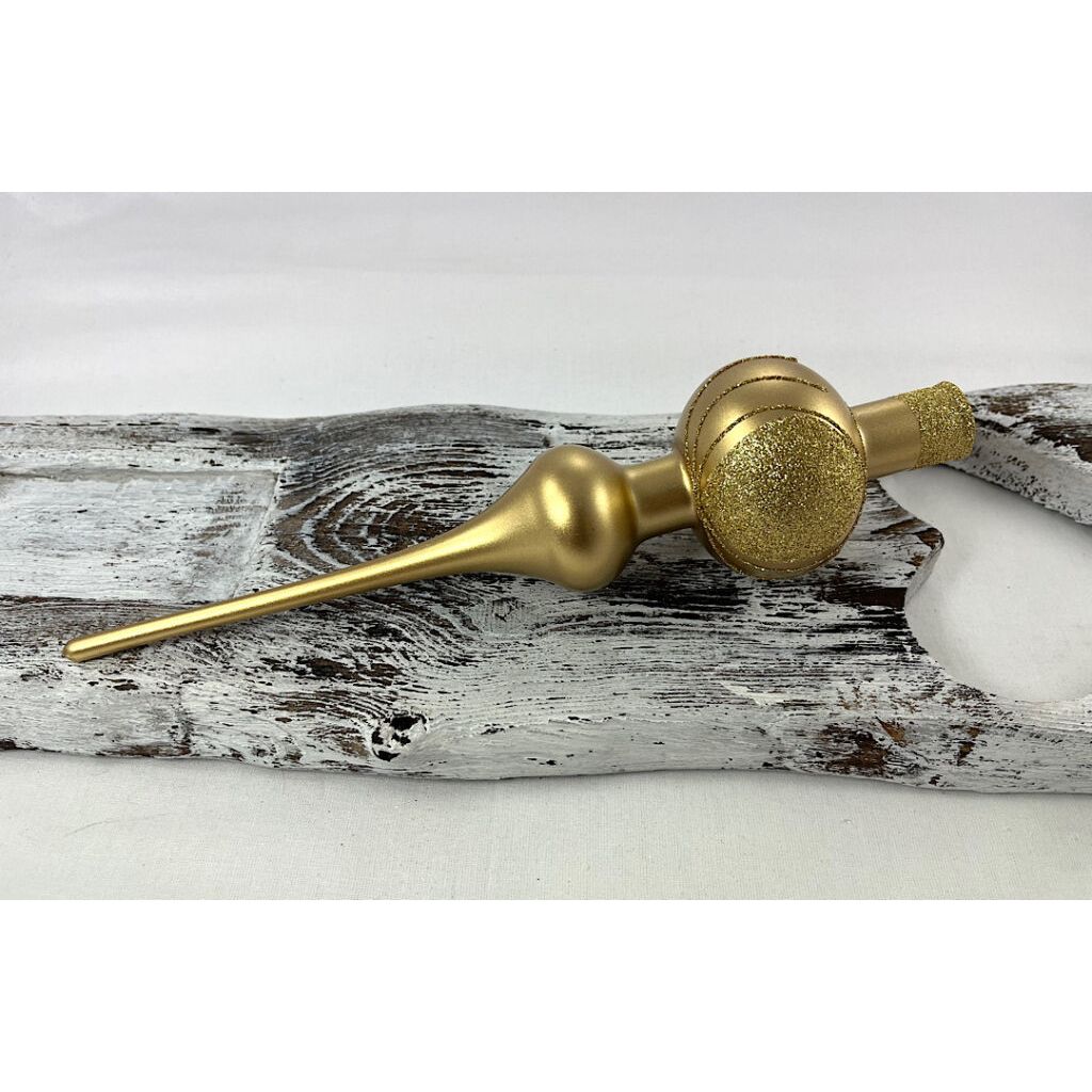 Sklenený špic vo farbe zlatá metalíza so zlatým dekorom.