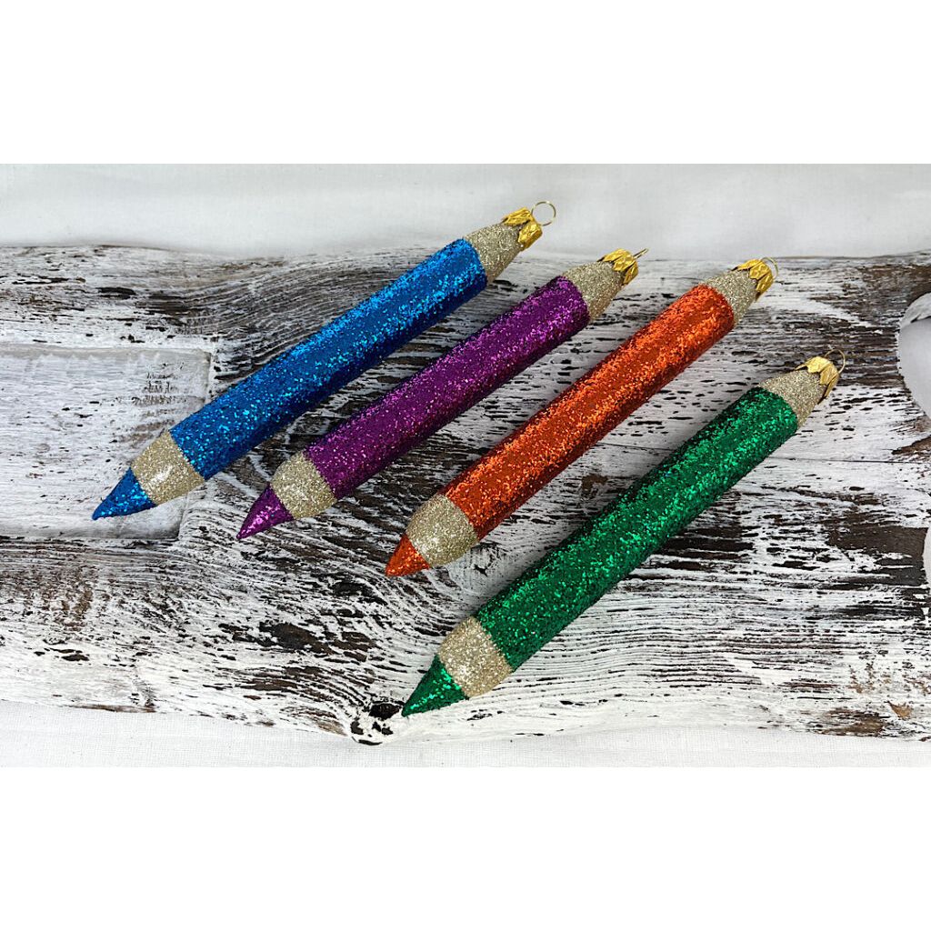 Sklenené ozdoby v podobe ceruziek . Sypané hrubým trblietavým posypom .