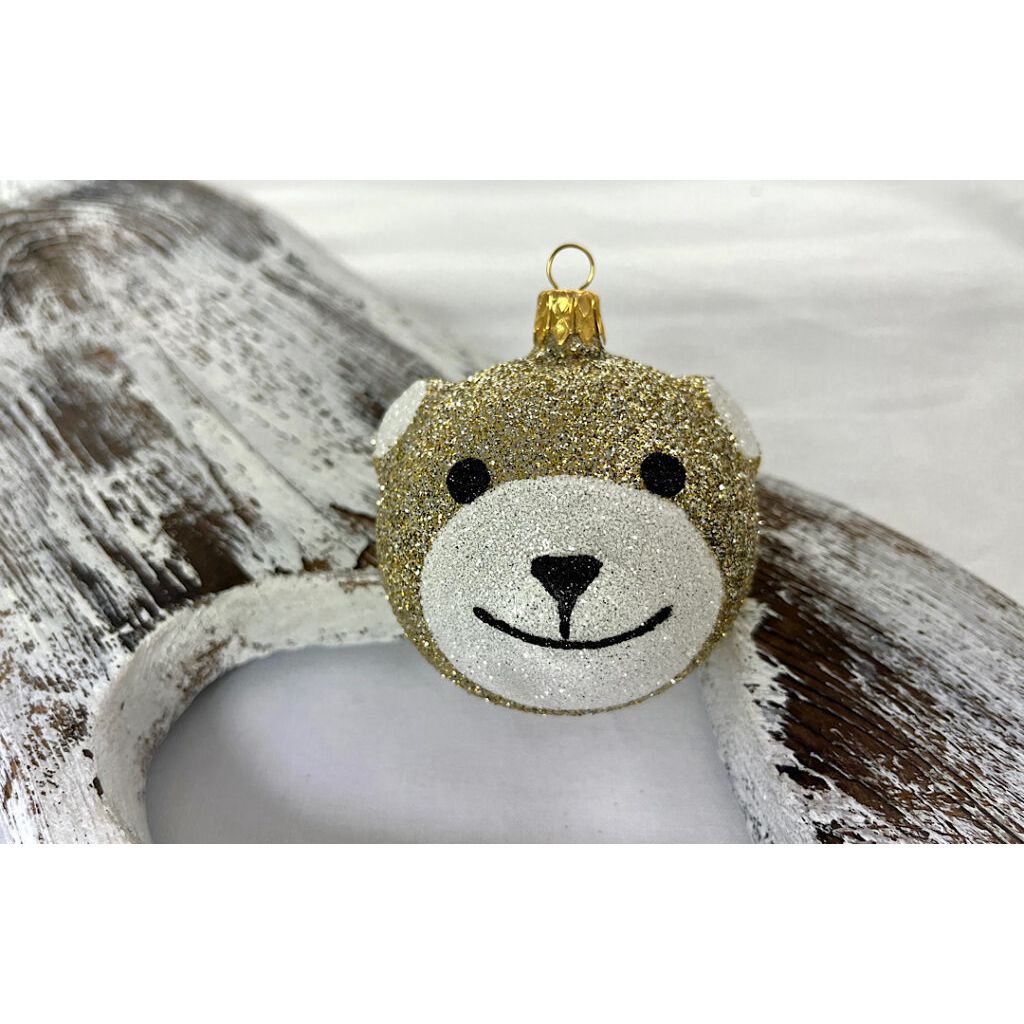Sklenená gulička maľovaná ako hlavička macka .  Zmiešaný zlatý a strieborný posyp vytvárajú trblietavý efekt . Macko má vypuklé uši.