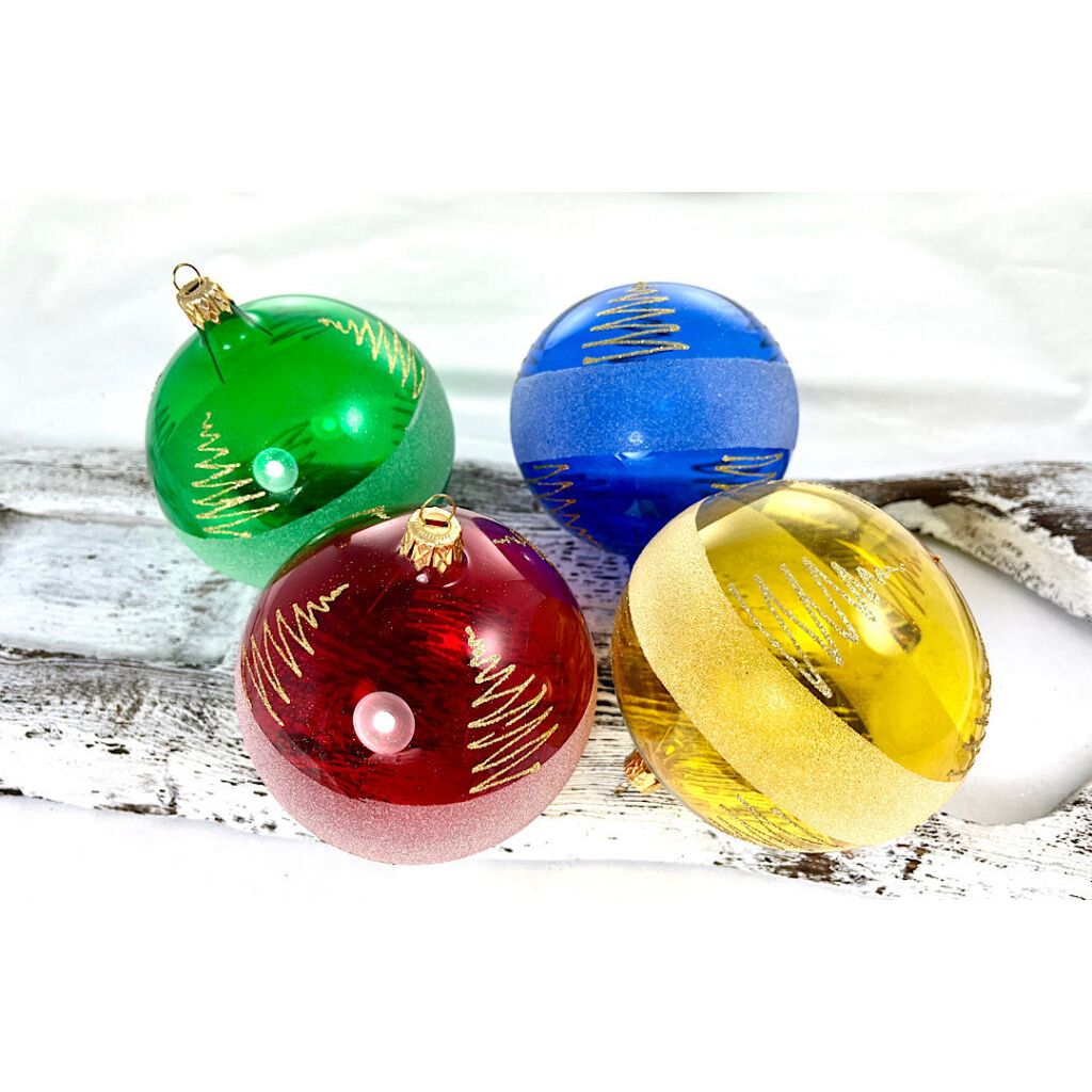 Sklenené číre guličky máčané vo farbách . Dekorované cik-cak stromčekmi.