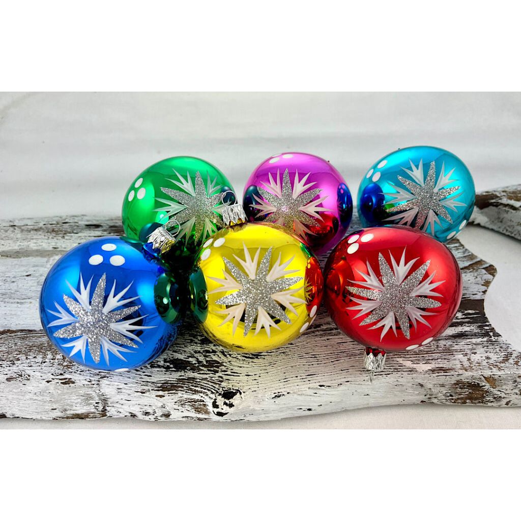 Sklenené vianočné guličky v retro farbách so striebornou hviezdou . V ponuke celá kolekcia .