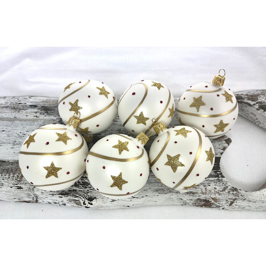 Sklenené vianočné guličky v bielej matnej farbe s hviezdičkami a červenými bodkami .
