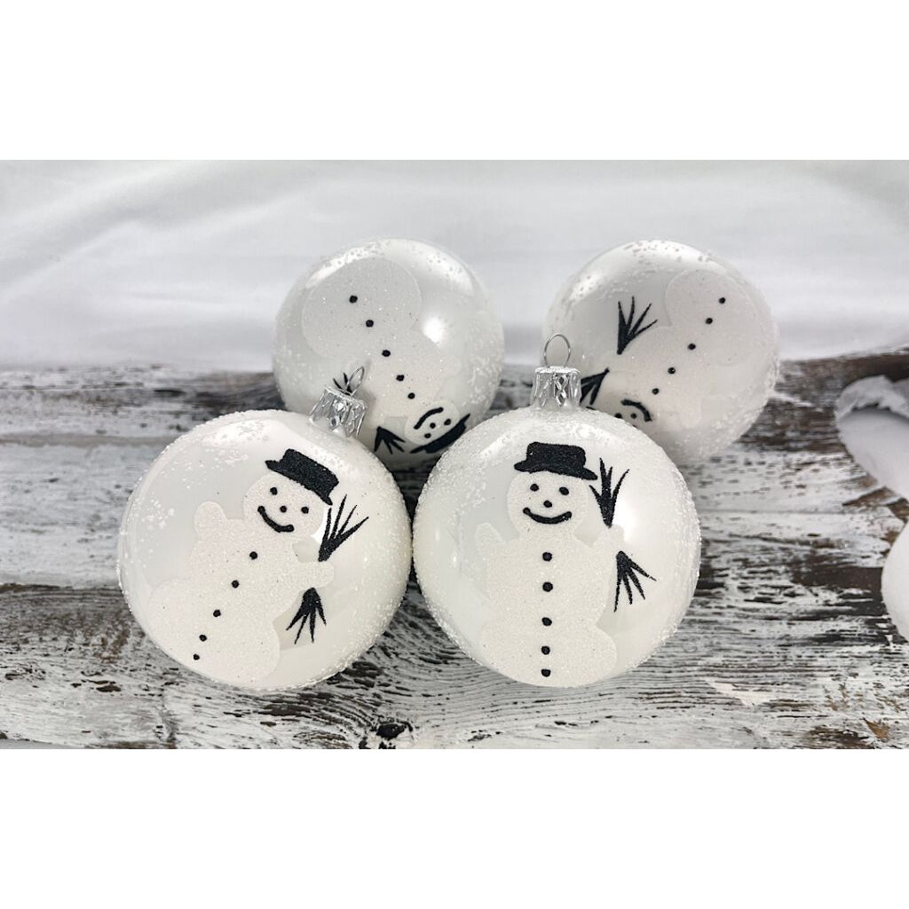 Sklenené guličky vo farbe biely porcelán s maľbou snehuliaka s metlou. Guličky sme vyrobili podľa starej predlohy . Nájdete ich v ponuke aj vo farebnej verzii.