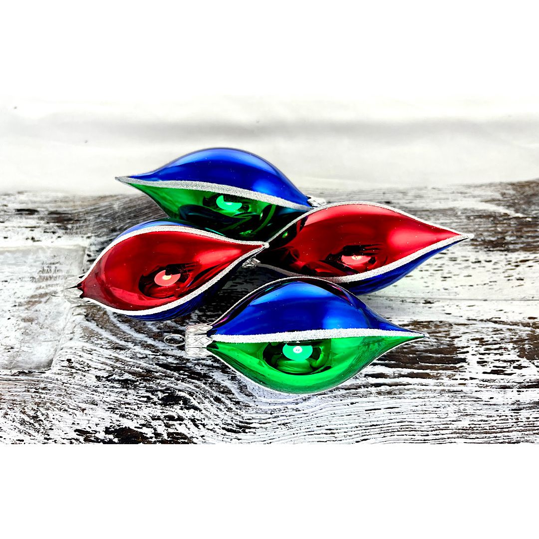 Sklenené olivky v retro štýle . Na každej olivke sa opakujú farby : modrá , zelená , modrá ,červená .