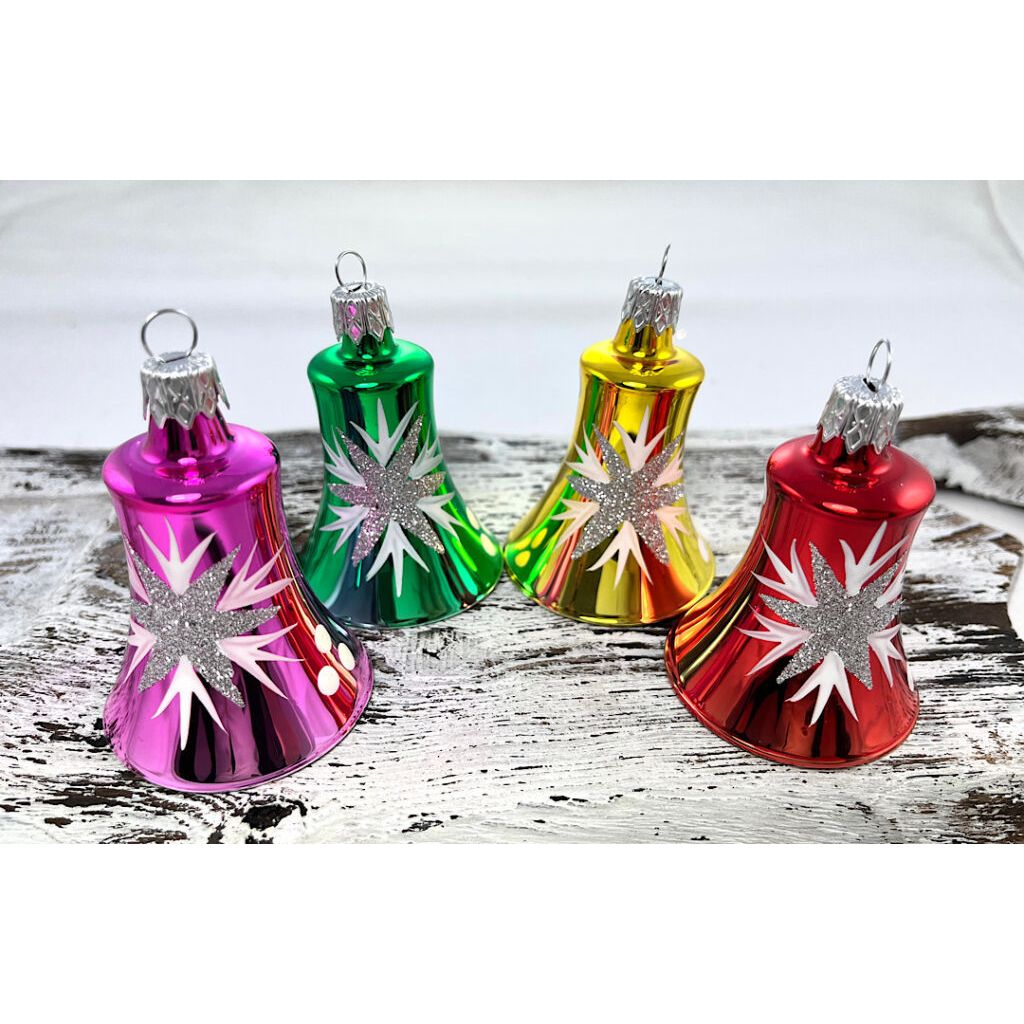 Sklenené vianočné zvončeky v retro farbách so striebornou hviezdou . V ponuke celá kolekcia .