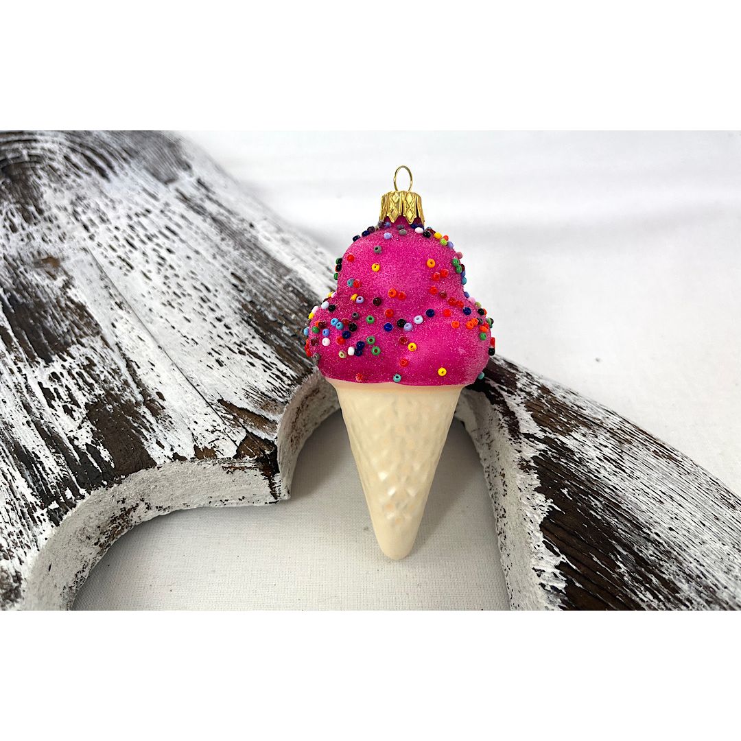 Ručne vyrobená sklenená ozdoba v tvare trojkopčekovej zmzliny. Kopčeky vo výraznej ružovej farby posypané veselými farebnými guľôčkami v kornútiku. Nezvyčajná , no hravá a neprehliadnuteľná ozdoba na vianočný stromček .