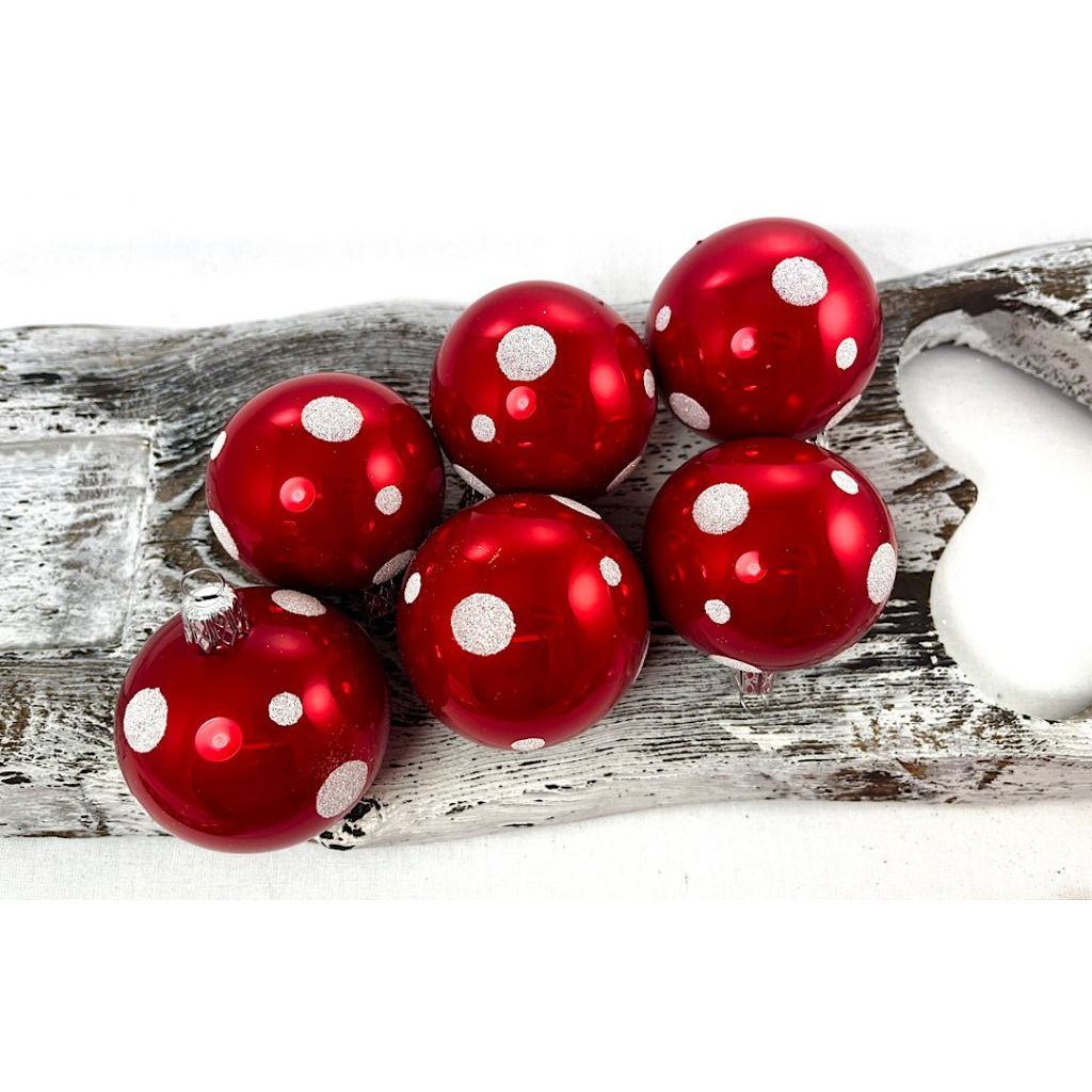 Sklenené vianočné guličky v červenej porcelánovej farbe s bielymi veľkými a malými bodkami.