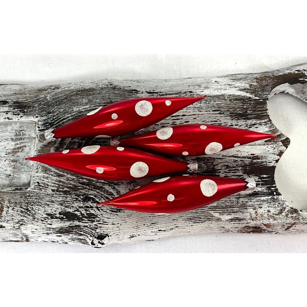 Sklenené vianočné raketky v červenej porcelánovej farbe s bielymi veľkými a malými bodkami.