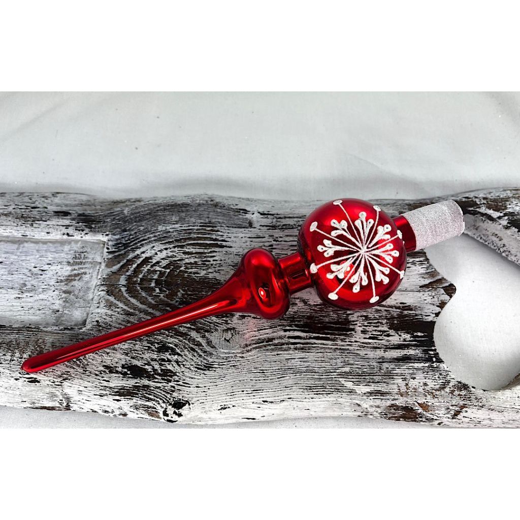 Sklenený žiarivý červený špic s veľkou vločkou .