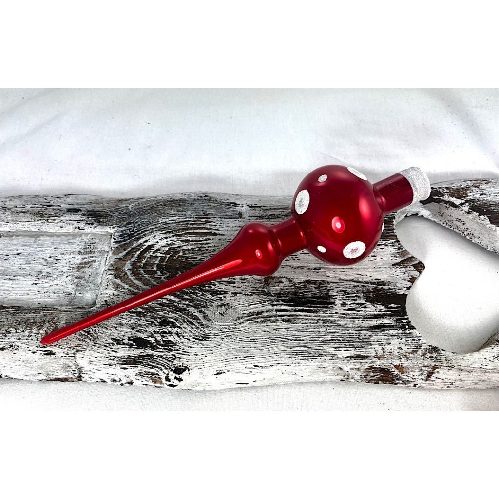 Sklenený vianočný špic v červenej porcelánovej farbe s bielymi veľkými a malými bodkami.