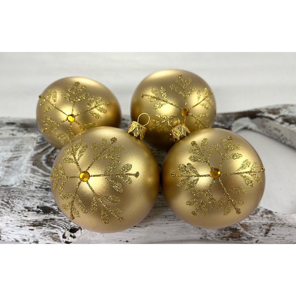 Sklenené guličky vo farbe zlatá metalíza s veľkou vločkou . V strede vločky sa nachádza kamienok.