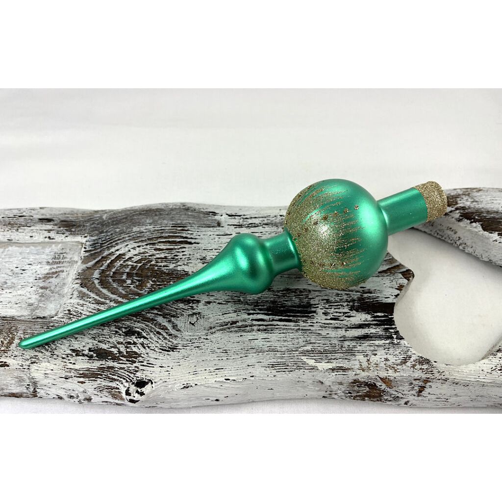 Sklenený špic vo farbe zelená metalíza so zlatým dekorom.