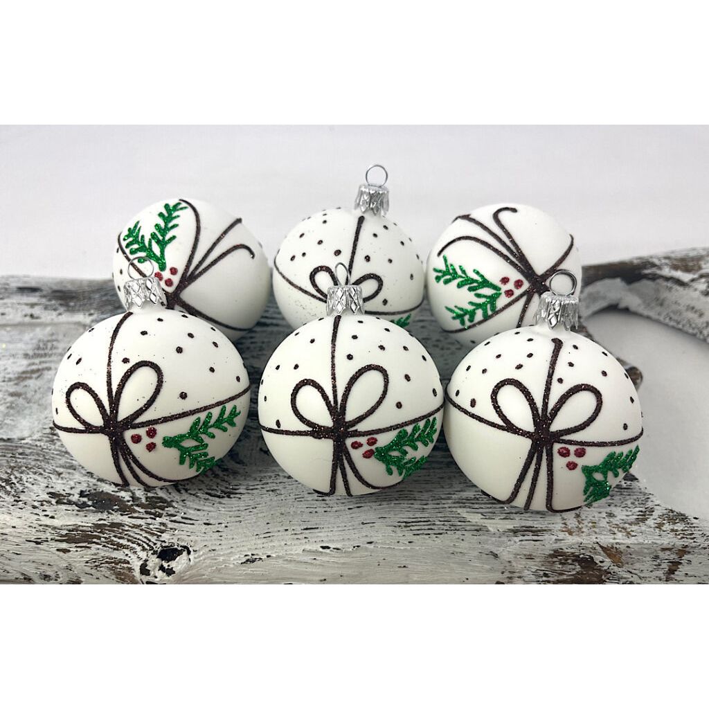 Sklenené guličky na bielom podklade s hnedou mašličkou a zelenou vetvičkou. Vzor je z oboch strán rovnaký.