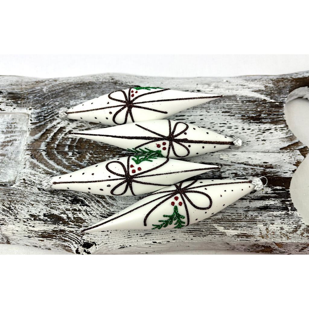 Sklenené raketky na bielom podklade s hnedou mašličkou a zelenou vetvičkou.