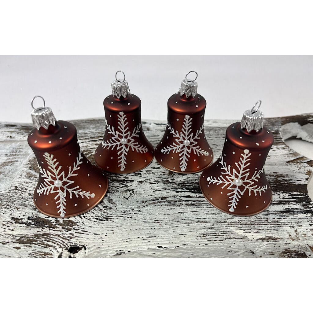 Sklenené zvončeky v hnedej matnej farbe s veľkou vločkou. V strede vločky sa nachádza biela perlička.