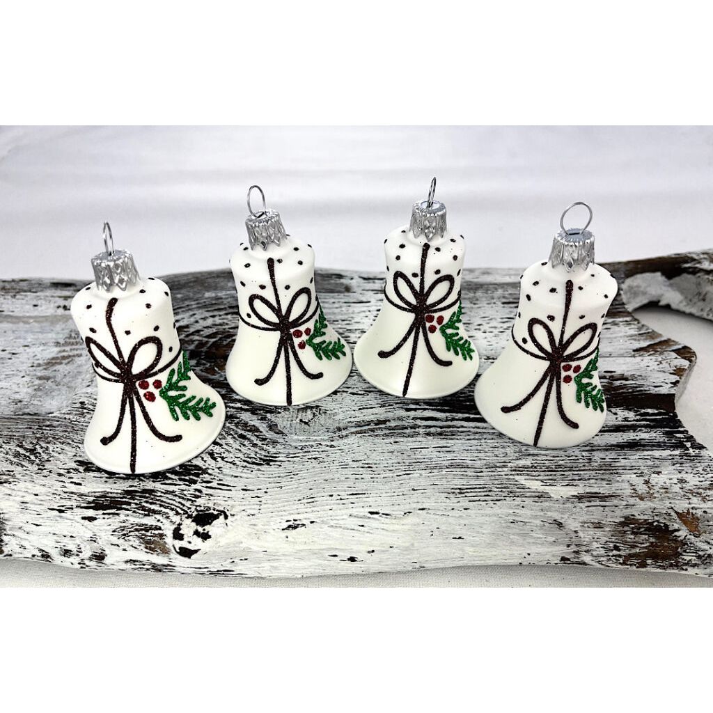 Sklenené zvončeky  na bielom podklade s hnedou mašličkou a zelenou vetvičkou.