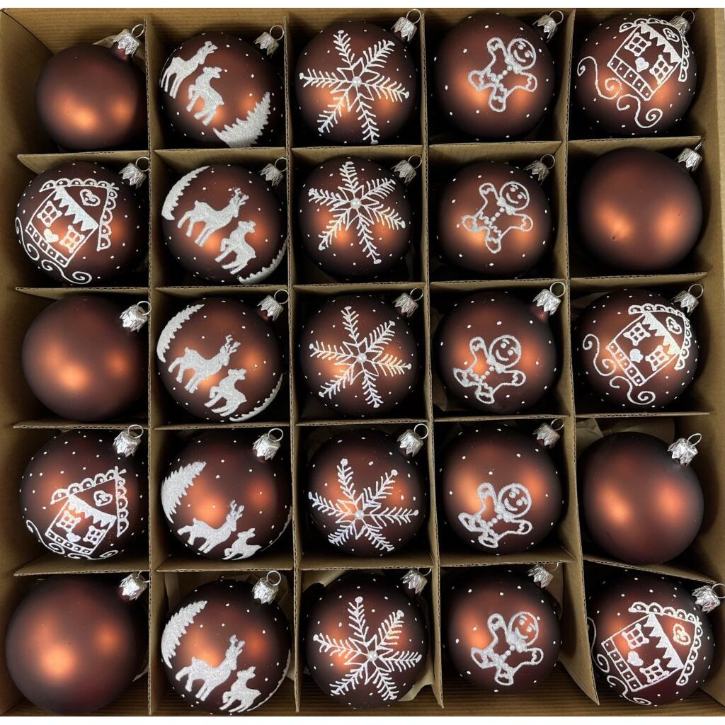 Sklenený vianočný set v hnedej matnej farbe v kombinácii s bielou. V sete sa nachádza 5 druhov po 5 ks .