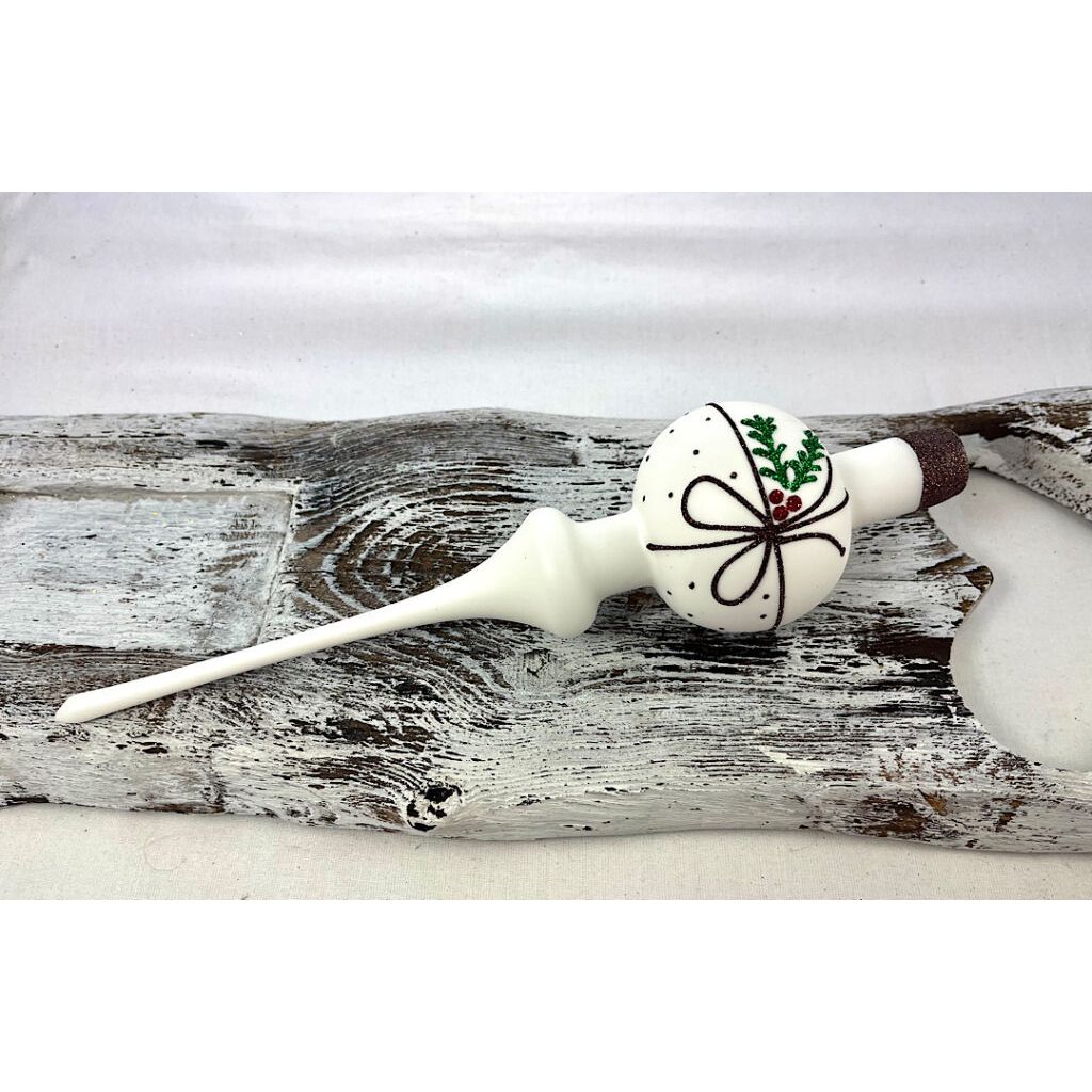Sklenený špic na bielom podklade s hnedou mašličkou a zelenou vetvičkou.